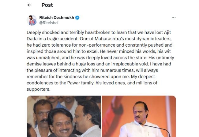 रितेश देशमुखने (Riteish Deshmukh Post) अजित पवार आणि विलासराव देशमुख (Vilasrao Deshmukh) यांचे खास फोटो शेअर करत पोस्ट लिहिली आहे की, “एका दुःखद अपघातात आपण अजित दादांना आपण गमावलं आहे, हे कळल्यावर मला मोठा धक्का बसलाय. मला प्रचंड दु:ख झालंय. महाराष्ट्राच्या सर्वात गतिमान नेत्यांपैकी एक असलेल्या अजित दादांना कामात कुचराई अजिबात मान्य नव्हती आणि ते आपल्या सभोवतालच्या लोकांना उत्कृष्ट कामगिरी करण्यासाठी सतत प्रेरित करत असत. ते स्पष्टवक्ते होते, त्यांची विनोदबुद्धी अतुलनीय होती आणि संपूर्ण राज्यात ते सर्वांचे लाडके होते. त्यांच्या अकाली निधनामुळं एक मोठी पोकळी निर्माण झाली आहे, जी कधीही भरून येणार नाही. मला त्यांच्याशी अनेकदा संवाद साधण्याची संधी मिळाली, आणि त्यांनी माझ्यावर केलेल्या प्रेमाबद्दल मी त्यांना नेहमीच स्मरणात ठेवीन. पवार कुटुंब, त्यांचे प्रियजन आणि लाखो समर्थकांप्रति माझ्या मनःपूर्वक संवेदना”. (Entertainment News)