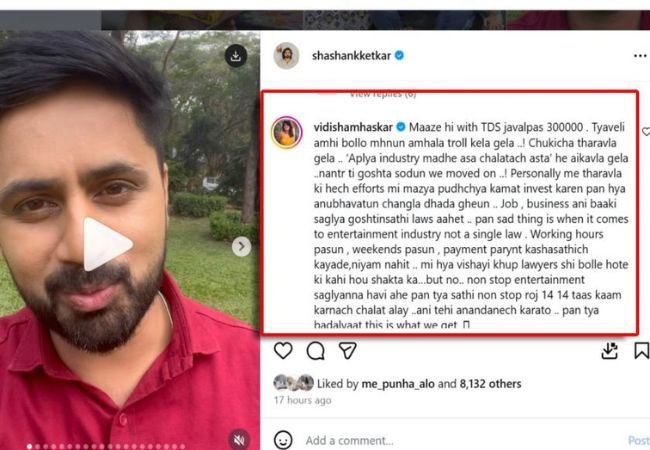 दरम्यान, शशांकने हा व्हिडिओ पोस्ट केल्यानंतर त्याच्या या व्हिडिओखाली कमेंट्समध्ये मराठीतील बऱ्याच कलाकारांनी त्यांची देखील कशाप्रकारे फसवूक झाली आणि मंदार देवस्थळींकडे किती पैसे अडकले आहेत हे लिहिलं आहे.अभिनेत्री विदिशा म्हसकरने शशांकच्या पोस्टवर कमेंट करत ३ लाख थकवल्याचं म्हटलं आहे. विदिशा मन हे बावरे मालिकेत खलनायिकेच्या भूमिकेत होती. “माझेही TDS सहित जवळपास ३ लाख रुपये आहेत. त्यावेळी आम्ही बोललो म्हणून आम्हाला ट्रोल केलं गेलं. चुकीचं ठरवलं गेलं. आपल्या इंडस्ट्रीमध्ये हे असंच चालतं, असं आम्हाला ऐकवलं गेलं. नंतर ही गोष्टच आपण सोडून दिली. या अनुभवातून चांगला धडा घेऊन मी ठरवलं की हेच प्रयत्न मी माझ्या पुढच्या कामात लावेन. जॉब, व्यवसाय बाकी सगळ्या गोष्टींसाठी कायदे आहेत. पण, आमच्या इंडस्ट्रीसाठी एकही कायदा नाही, हे वाईट आहे”, असं विदिशाने म्हटलं आहे.